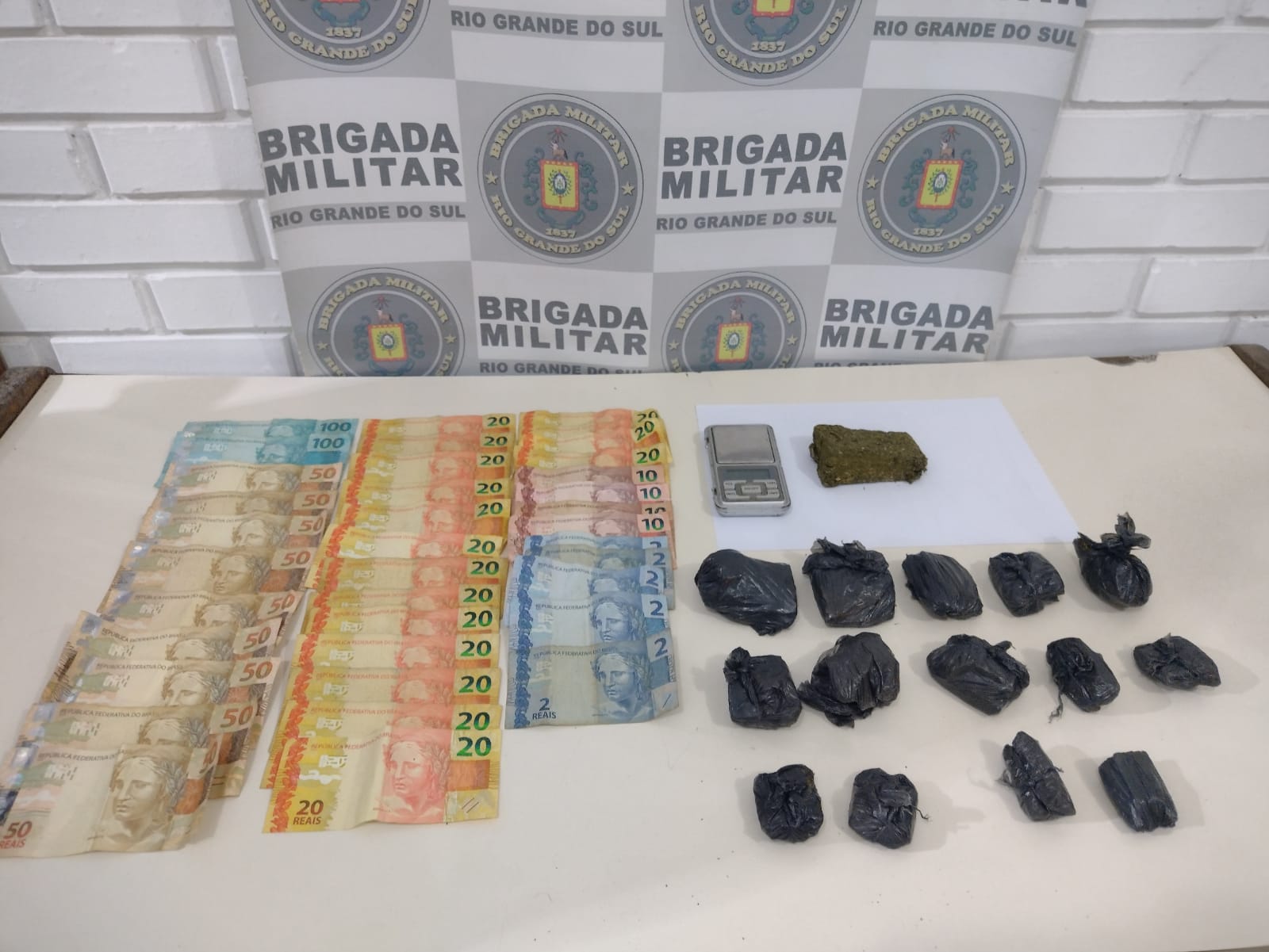 Na revista pessoal, foram encontradas diversas notas amassadas, totalizando R$ 1.040,00, e uma sacola plástica contendo 15 torrões grandes de maconha, pesando ao todo 404 gramas. No chão, próximo ao local da abordagem, foi localizada a balança de precisão marca QCPASS HD.