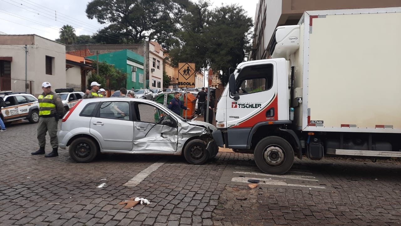 Uma colisão entre dois carros e um caminhão, na esquina da Escola Antônio Vicente, cruzamento das Ruas Gabriel Leon com Liberato Salzano, assustou quem passava no local na tarde desta terça – feira, 05.