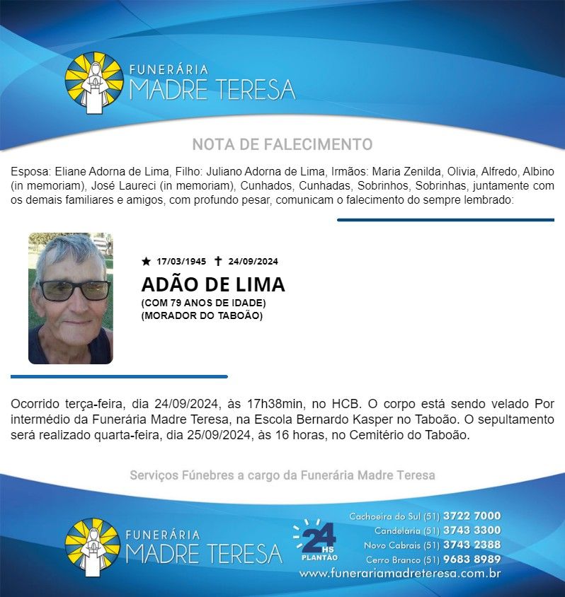 Falecimentos ADÃO DE LIMA Francis Soares 25 de setembro de 2024 Post navigation Previous: MARIA DE LOURDES DOS SANTOS GOULARTE (TIA MARIA)Next: Defesa Civil alerta para possibilidade de mais chuvas nos próximos dias no Rio Grande do Sul Mais notícias Falecimentos MARION DA SILVA (SÃO NUNCA) Francis Soares 21 de fevereiro de 2025 Falecimentos ROMANI KEGLER NUNES Francis Soares 17 de fevereiro de 2025 Falecimentos ROMARINO “EDILON CARDOSO” PEREIRA Francis Soares 17 de fevereiro de 2025 Deixe um comentário Cancelar respostaO seu endereço de e-mail não será publicado. Campos obrigatórios são marcados com *Comentário * Nome * E-mail * Site Salvar meus dados neste navegador para a próxima vez que eu comentar. Δ