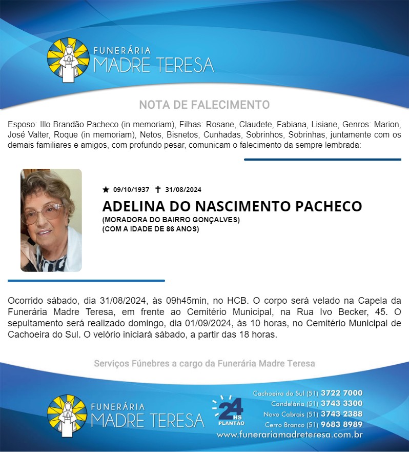 Falecimentos ADELINA DO NASCIMENTO PACHECO Francis Soares 31 de agosto de 2024 Post navigation Previous: SUELI TERESINHA GODOINext: MARIA SÔNIA STENEMANN Mais notícias Falecimentos MARION DA SILVA (SÃO NUNCA) Francis Soares 21 de fevereiro de 2025 Falecimentos ROMANI KEGLER NUNES Francis Soares 17 de fevereiro de 2025 Falecimentos ROMARINO “EDILON CARDOSO” PEREIRA Francis Soares 17 de fevereiro de 2025 Deixe um comentário Cancelar respostaO seu endereço de e-mail não será publicado. Campos obrigatórios são marcados com *Comentário * Nome * E-mail * Site Salvar meus dados neste navegador para a próxima vez que eu comentar. Δ