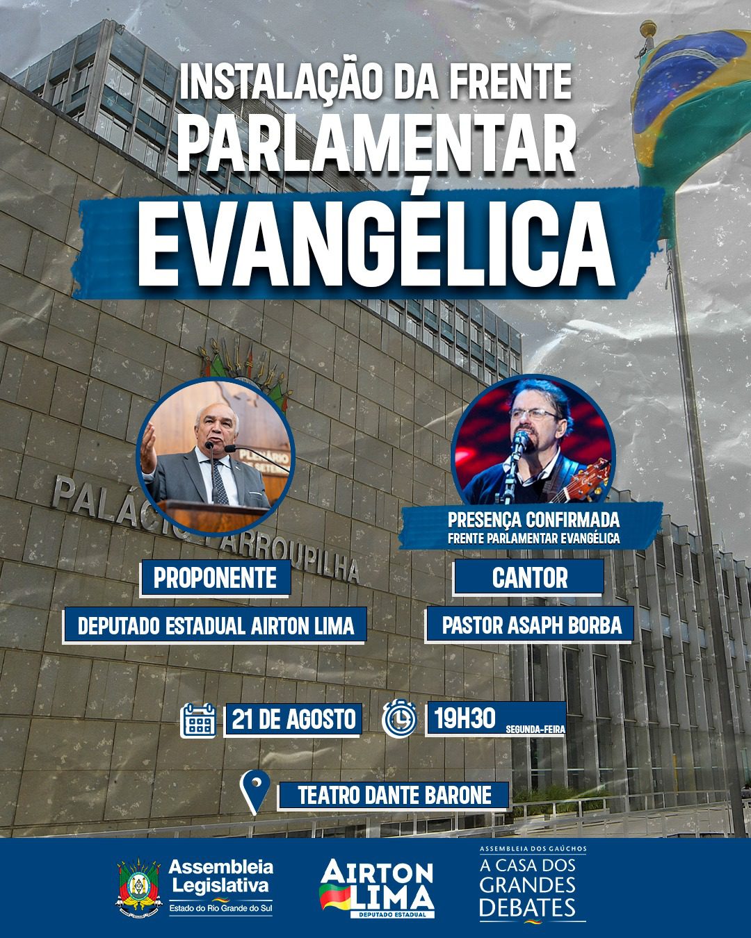 A primeira Frente Parlamentar Evangélica da Assembleia Legislativa gaúcha será instalada neste mês, no Teatro Dante Barone. Proposta pelo deputado Airton Lima (Podemos), que presidirá os trabalhos, a frente tem o objetivo de reunir lideranças e parlamentares que comungam da fé cristã, estabelecendo um ponto de representatividade à defesa de valores compartilhados pela população evangélica no acompanhamento de políticas públicas, programas governamentais e debates de questões sociais em pauta.