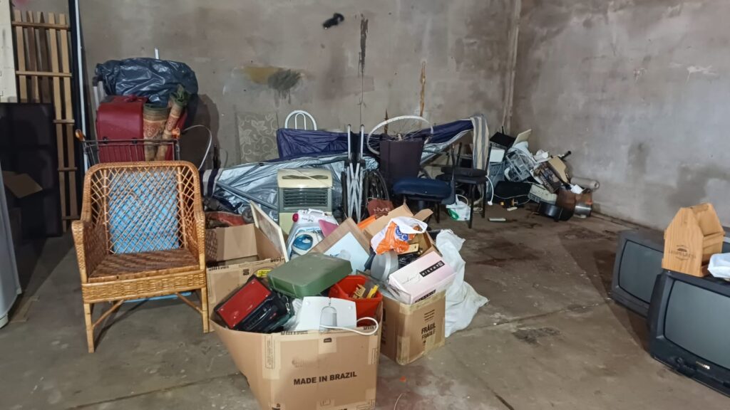 Material reciclável (papelão, livros, garrafas PET, latas de cerveja e plásticos);