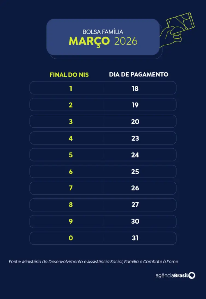 A Caixa Econômica Federal começa a pagar a parcela de março do Bolsa Família. Recebem nesta quarta-feira (18) os beneficiários com Número de Inscrição Social (NIS) de final 1. Ao todo cerca de 18,7 milhões de famílias receberão o benefício neste mês.