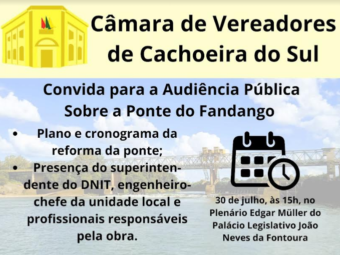 O Plenário Edgar Müller recebe nesta terça-feira, 30, audiência pública para apresentação do cronograma e do plano da reforma da Ponte do Fandango, às 15h. Participam da audiência o superintendente do DNIT, Hiratan Pinheiro da Silva, o engenheiro-chefe da unidade regional, João Carlos Tonetto, e profissionais responsáveis pela obra.