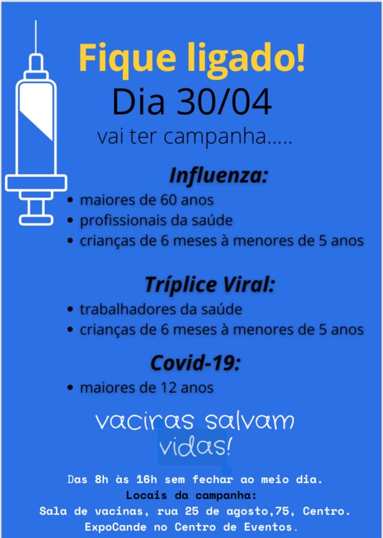 A vacinação acontece na Sala de Vacinas na Rua 25 de agosto, 75 e também na Expocande, no Centro de Eventos. As vacinas acontecem das 8hs às 16hs sem interrupção ao meio dia.