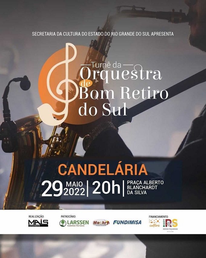 A Prefeitura Municipal de Candelária, através da Secretaria Municipal de Turismo, Cultura e Esporte, trazem para Candelária no próximo domingo, às 20 horas, a apresentação da Orquestra de Bom Retiro do Sul, na Rua Coberta ao lado da Praça Alberto Blanchardt da Silveira. O show, imperdível e que tem custo zero para Candelária, tem a realização de Mais Cultura e Arte.
