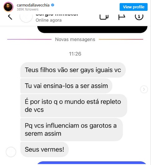 “Teus filhos vão ser gays iguais a você, ‘tu’ vai ensiná-los a ser assim. É por isso que o mundo está repleto de ‘vocês’, porque vocês influenciam os garotos a serem assim. Seus vermes!”, discriminou o homofóbico.