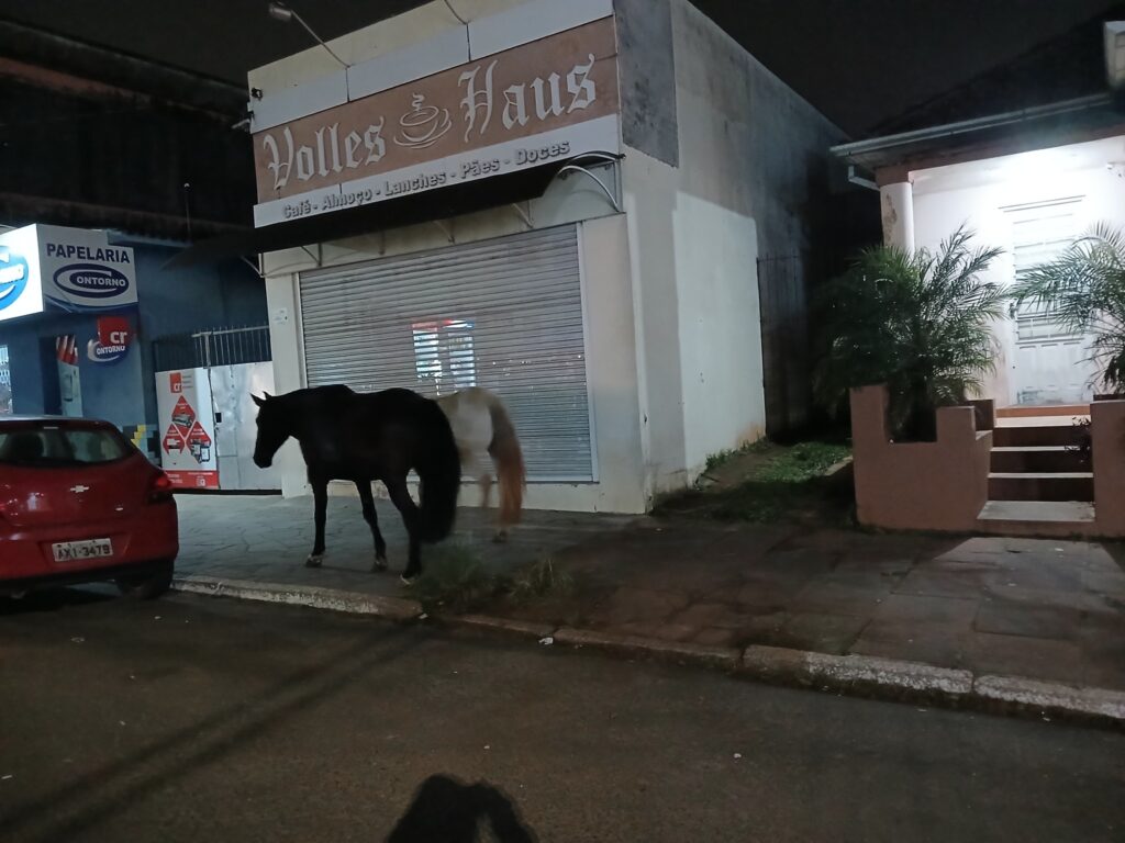 Dois cavalos circulando livremente na Avenida Brasil, em Cachoeira do Sul, nas proximidades do Banco do Brasil, na noite deste domingo (13), chamaram a atenção de quem passava pelo local. O flagrante, registrado por populares, repercutiu nas redes sociais com postagens que misturaram preocupação com bom humor.