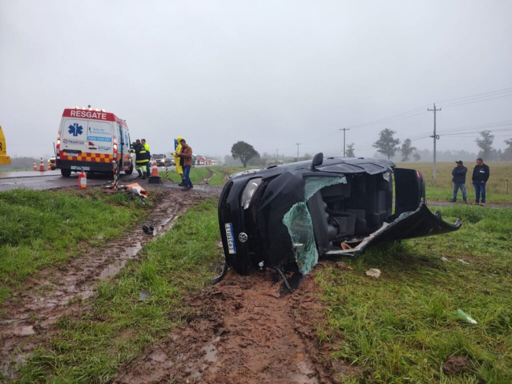 Por volta das 9h15 da manhã desta quinta, 23, no km 126 da rodovia, próximo da Loja Flores em Vale do Sol, foi registrado um acidente envolvendo um Ford Ka de cor vermelha, com 2 passageiros, e um Volkswagen Voyage de cor preta, com 3 pessoas a bordo. A Polícia Rodoviária Estadual, a Brigada Militar e a Concessionário Rota de Santa Maria atenderam a ocorrência no local.