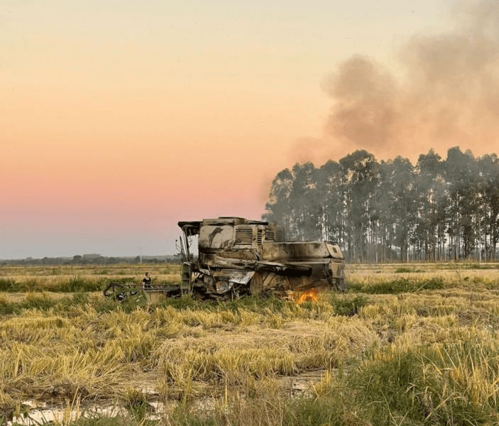 Um incêndio destruiu uma colheitadeira na localidade de Rebentona, no interior de Candelária. O caso – registrado na tarde desta terça-feira – mobilizou o Corpo de Bombeiros Voluntários, mas as condições da estrada resultaram no atolamento do caminhão que foi utilizado.