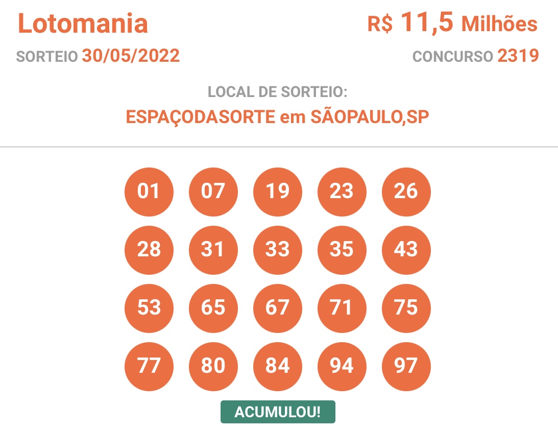 Loterias Confira os resultados das loterias do dia 30/05 admin 31 de maio de 2022 Post navigation Previous: Mensagem: VALE SEMPRE A PENANext: Falecimento / Maria do Carmo Oliveira Machado Mais notícias Loterias Brasil e Mundo Últimas Notícias Mega-Sena pode pagar R$ 46 milhões nesta terça-feira; apostas vão até as 19h Francis Soares 15 de julho de 2025 Brasil e Mundo Loterias Últimas Notícias Mega-Sena sorteia R$ 28 milhões nesta terça-feira Francis Soares 8 de julho de 2025 Brasil e Mundo Loterias Últimas Notícias Apostador de Goiânia leva sozinho prêmio de R$ 50,7 milhões da Mega-Sena Francis Soares 2 de julho de 2025 Deixe um comentário Cancelar respostaO seu endereço de e-mail não será publicado. Campos obrigatórios são marcados com *Comentário * Nome * E-mail * Site Salvar meus dados neste navegador para a próxima vez que eu comentar. Δ