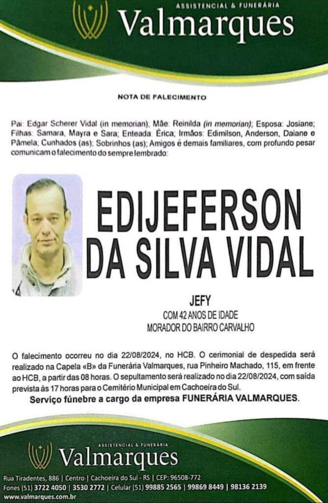 Falecimentos EDIJEFERSON DA SILVA VIDAL (JEFY) Francis Soares 22 de agosto de 2024 Post navigation Previous: CESAR ERNESTO CORREA DA SILVEIRA (PITI)Next: Morre a cantora Diana, do sucesso ‘Porque Brigamos’ Mais notícias Falecimentos MARION DA SILVA (SÃO NUNCA) Francis Soares 21 de fevereiro de 2025 Falecimentos ROMANI KEGLER NUNES Francis Soares 17 de fevereiro de 2025 Falecimentos ROMARINO “EDILON CARDOSO” PEREIRA Francis Soares 17 de fevereiro de 2025 Deixe um comentário Cancelar respostaO seu endereço de e-mail não será publicado. Campos obrigatórios são marcados com *Comentário * Nome * E-mail * Site Salvar meus dados neste navegador para a próxima vez que eu comentar. Δ