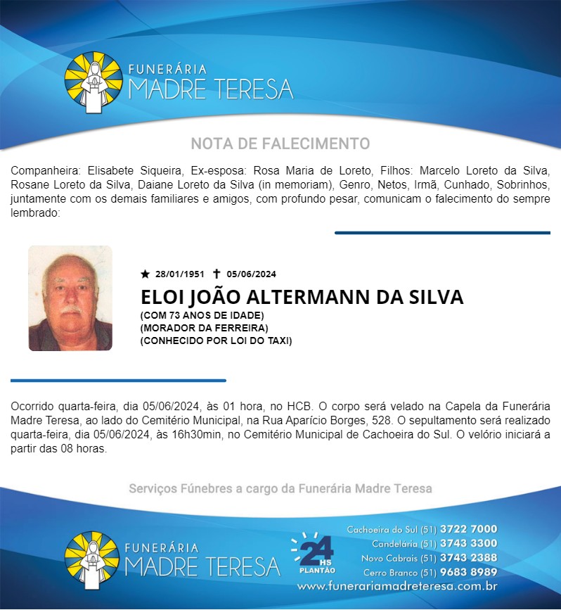 Falecimentos ELOI JOÃO ALTERMANN DA SILVA Francis Soares 5 de junho de 2024 Post navigation Previous: ARNILDO RUDI RADTKENext: Homem é baleado na nádega após roubar uma farmácia e tentar assaltar policiais em Santa Maria Mais notícias Falecimentos MARION DA SILVA (SÃO NUNCA) Francis Soares 21 de fevereiro de 2025 Falecimentos ROMANI KEGLER NUNES Francis Soares 17 de fevereiro de 2025 Falecimentos ROMARINO “EDILON CARDOSO” PEREIRA Francis Soares 17 de fevereiro de 2025 Deixe um comentário Cancelar respostaO seu endereço de e-mail não será publicado. Campos obrigatórios são marcados com *Comentário * Nome * E-mail * Site Salvar meus dados neste navegador para a próxima vez que eu comentar. Δ