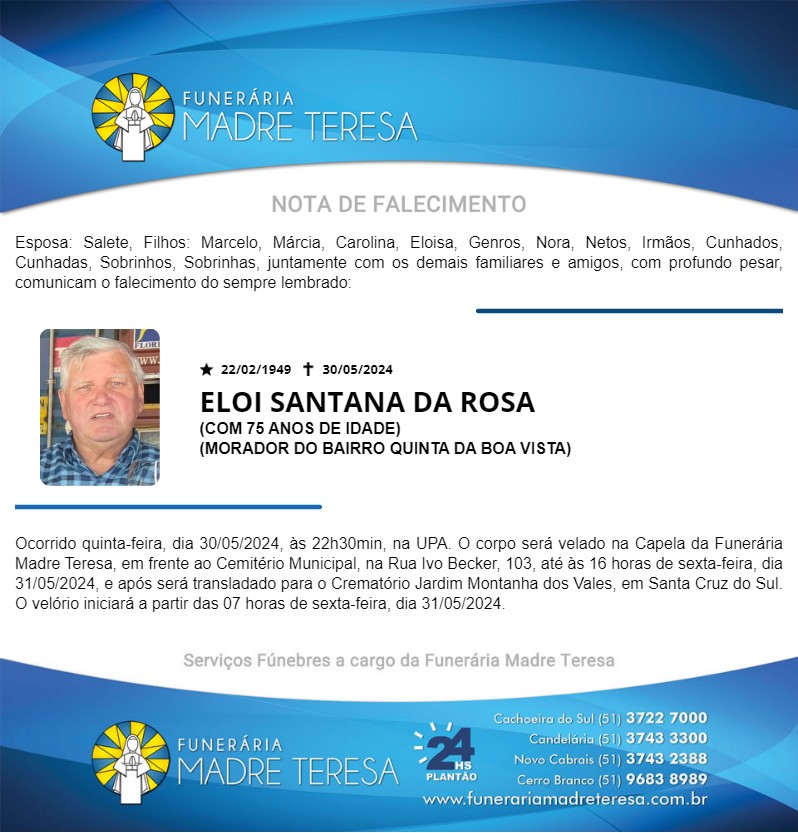 Falecimentos ELOI SANTANA DA ROSA Francis Soares 31 de maio de 2024 Post navigation Previous: ALIRES MARTINS TESCHNext: Governo gaúcho apresenta balanço de 30 dias após início das enchentes e detalha iniciativas para reconstrução do RS Mais notícias Falecimentos MARION DA SILVA (SÃO NUNCA) Francis Soares 21 de fevereiro de 2025 Falecimentos ROMANI KEGLER NUNES Francis Soares 17 de fevereiro de 2025 Falecimentos ROMARINO “EDILON CARDOSO” PEREIRA Francis Soares 17 de fevereiro de 2025 Deixe um comentário Cancelar respostaO seu endereço de e-mail não será publicado. Campos obrigatórios são marcados com *Comentário * Nome * E-mail * Site Salvar meus dados neste navegador para a próxima vez que eu comentar. Δ