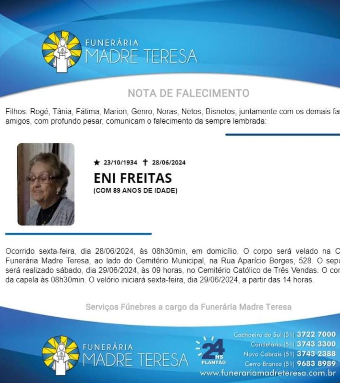 Falecimentos ENI FREITAS Francis Soares 29 de junho de 2024 Post navigation Previous: MAURO RIBEIRONext: Sábado será de sol, frio e geada em Cachoeira do Sul Mais notícias Falecimentos MARION DA SILVA (SÃO NUNCA) Francis Soares 21 de fevereiro de 2025 Falecimentos ROMANI KEGLER NUNES Francis Soares 17 de fevereiro de 2025 Falecimentos ROMARINO “EDILON CARDOSO” PEREIRA Francis Soares 17 de fevereiro de 2025 Deixe um comentário Cancelar respostaO seu endereço de e-mail não será publicado. Campos obrigatórios são marcados com *Comentário * Nome * E-mail * Site Salvar meus dados neste navegador para a próxima vez que eu comentar. Δ