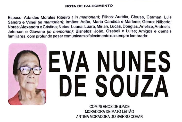 Falecimentos EVA NUNES DE SOUZA Francis Soares 31 de maio de 2024 Post navigation Previous: JOSÉ RONI FREITAS DE MOURANext: OLIVIA CALLONTI ELESBÃO Mais notícias Falecimentos MARION DA SILVA (SÃO NUNCA) Francis Soares 21 de fevereiro de 2025 Falecimentos ROMANI KEGLER NUNES Francis Soares 17 de fevereiro de 2025 Falecimentos ROMARINO “EDILON CARDOSO” PEREIRA Francis Soares 17 de fevereiro de 2025 Deixe um comentário Cancelar respostaO seu endereço de e-mail não será publicado. Campos obrigatórios são marcados com *Comentário * Nome * E-mail * Site Salvar meus dados neste navegador para a próxima vez que eu comentar. Δ