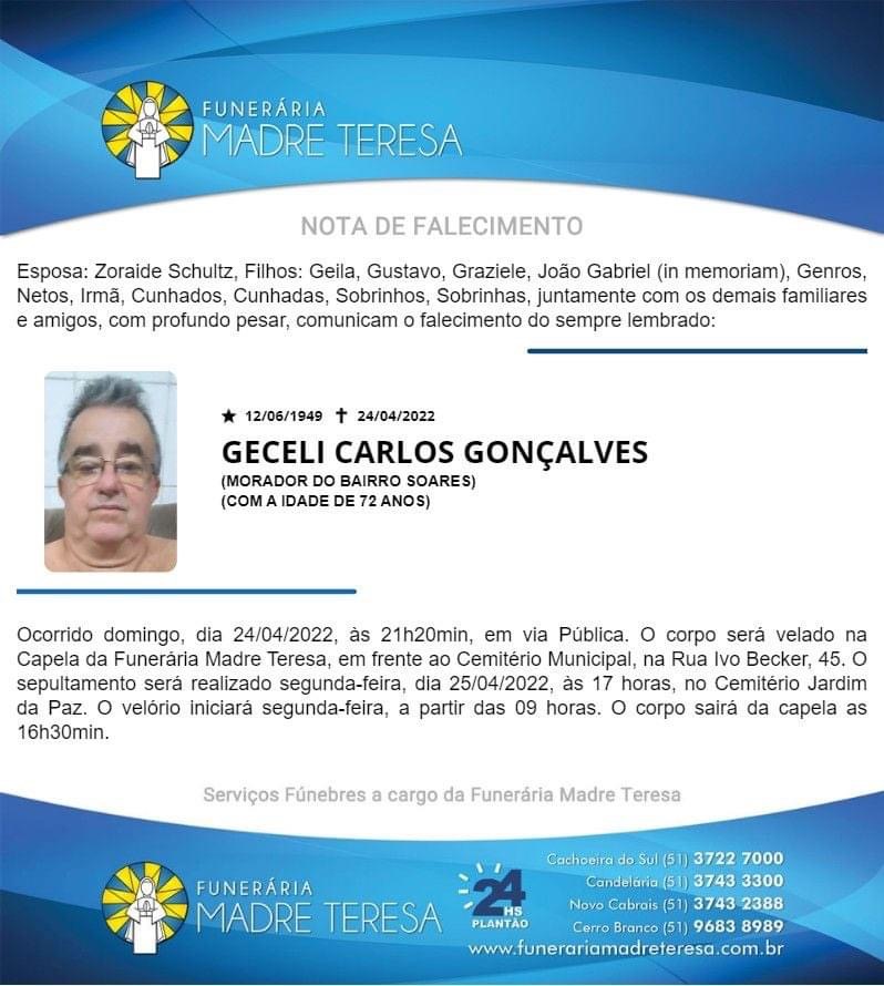 Falecimentos Falecimemto / Geceli Carlos Gonçalves admin 25 de abril de 2022 Post navigation Previous: BBB22: Eliezer é o 17º eliminado e Arthur, Douglas e PA estão na final Next: Falecimento / Antonio dos Santos Mais notícias Falecimentos MARION DA SILVA (SÃO NUNCA) Francis Soares 21 de fevereiro de 2025 Falecimentos ROMANI KEGLER NUNES Francis Soares 17 de fevereiro de 2025 Falecimentos ROMARINO “EDILON CARDOSO” PEREIRA Francis Soares 17 de fevereiro de 2025 Deixe um comentário Cancelar respostaO seu endereço de e-mail não será publicado. Campos obrigatórios são marcados com *Comentário * Nome * E-mail * Site Salvar meus dados neste navegador para a próxima vez que eu comentar. Δ