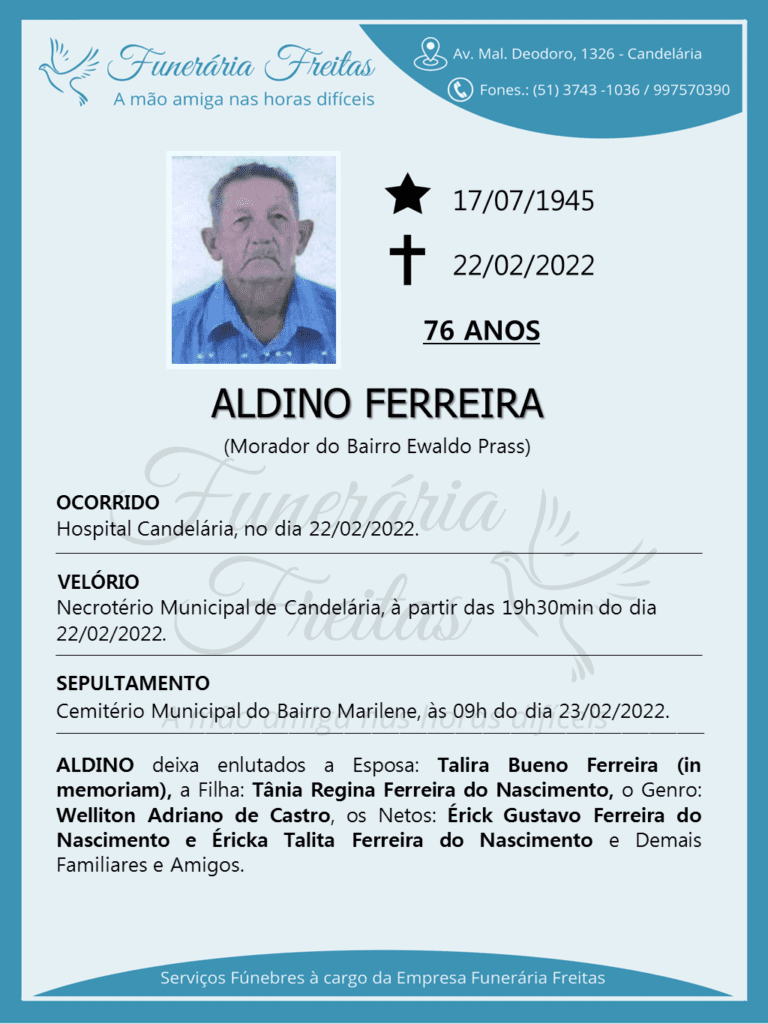 Falecimentos Falecimento / Aldino Ferreira admin 22 de fevereiro de 2022 Post navigation Previous: Prefeitura publica Decreto 017/2022Next: NOTA DE FALECIMENTO / Docelina Bembom Loreto Mais notícias Falecimentos MARION DA SILVA (SÃO NUNCA) Francis Soares 21 de fevereiro de 2025 Falecimentos ROMANI KEGLER NUNES Francis Soares 17 de fevereiro de 2025 Falecimentos ROMARINO “EDILON CARDOSO” PEREIRA Francis Soares 17 de fevereiro de 2025 Deixe um comentário Cancelar respostaO seu endereço de e-mail não será publicado. Campos obrigatórios são marcados com *Comentário * Nome * E-mail * Site Salvar meus dados neste navegador para a próxima vez que eu comentar. Δ