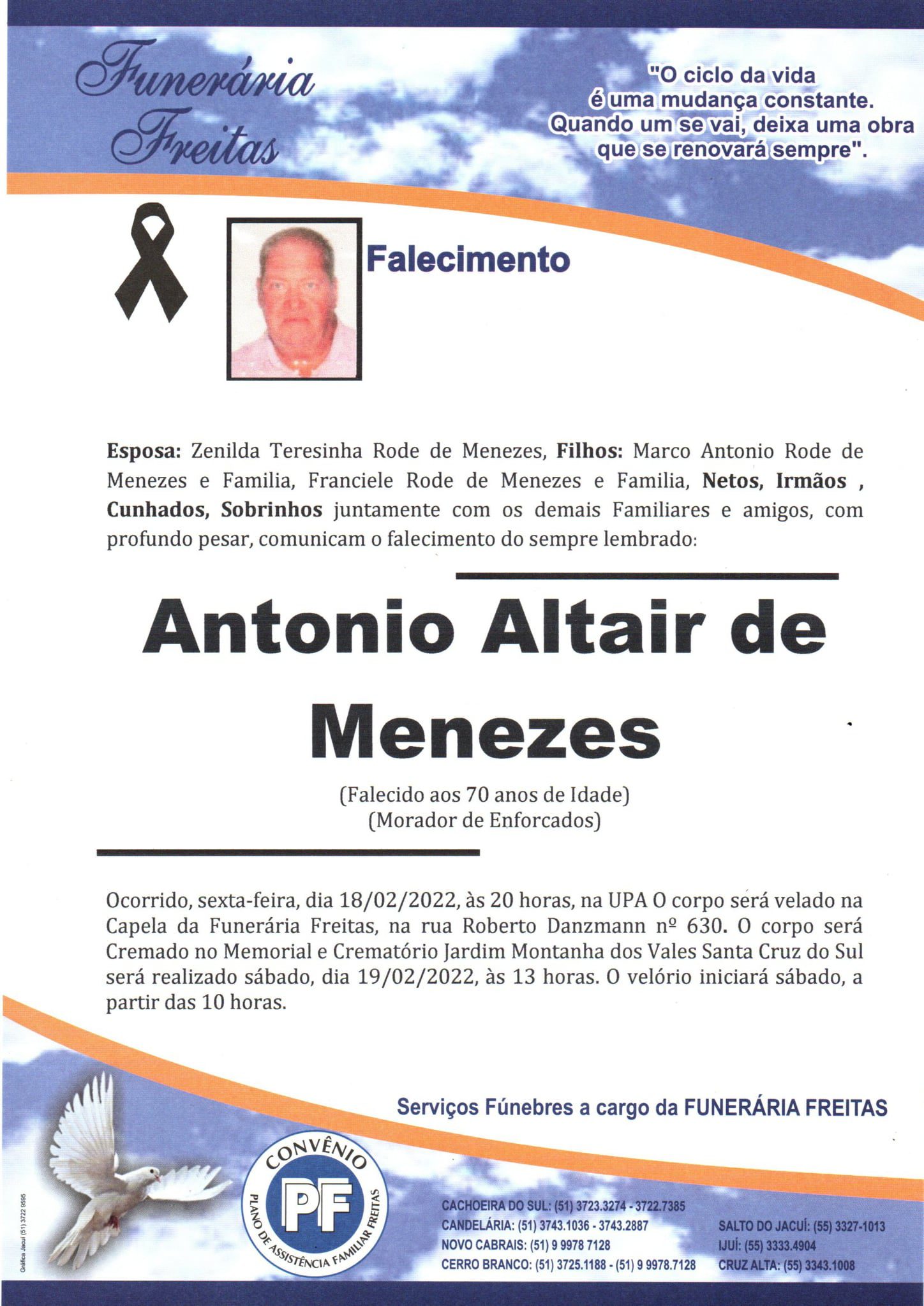 Falecimentos Falecimento / Antonio Altair de Menezes admin 19 de fevereiro de 2022 Post navigation Previous: Falecimento / Paulo Roberto da Silva CavalheiroNext: Falecimento / Moacyr Angelo Tolotti Mais notícias Falecimentos MARION DA SILVA (SÃO NUNCA) Francis Soares 21 de fevereiro de 2025 Falecimentos ROMANI KEGLER NUNES Francis Soares 17 de fevereiro de 2025 Falecimentos ROMARINO “EDILON CARDOSO” PEREIRA Francis Soares 17 de fevereiro de 2025 Deixe um comentário Cancelar respostaO seu endereço de e-mail não será publicado. Campos obrigatórios são marcados com *Comentário * Nome * E-mail * Site Salvar meus dados neste navegador para a próxima vez que eu comentar. Δ