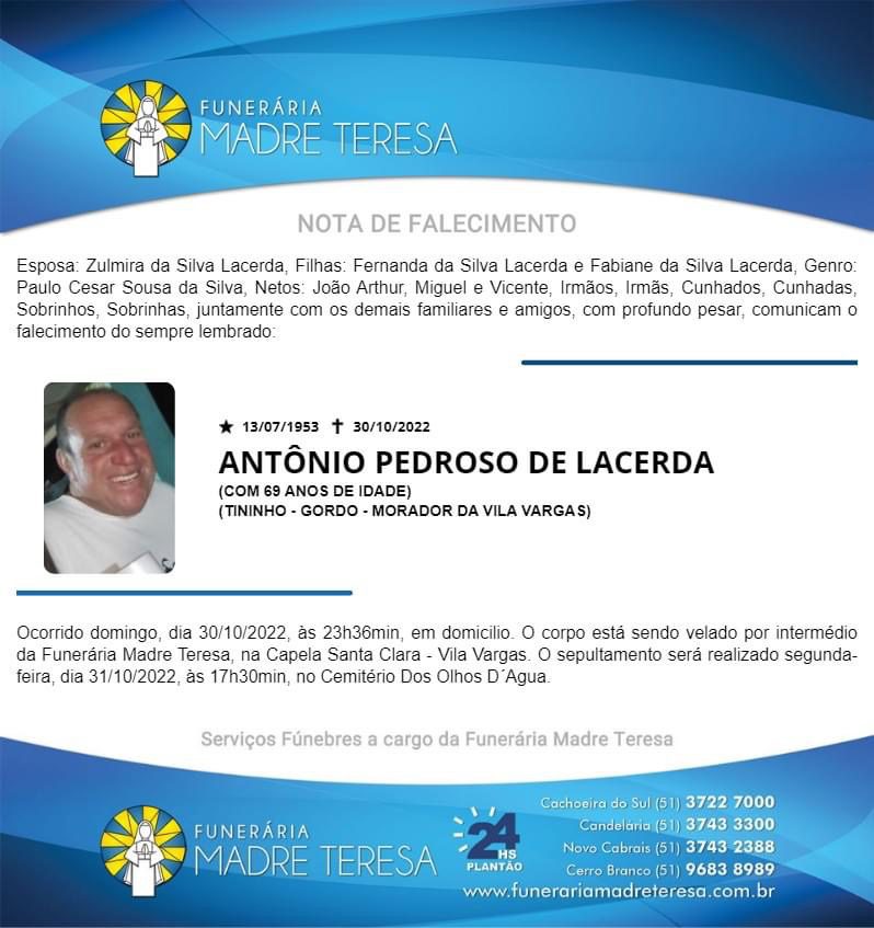 Falecimentos Falecimento / Antonio Pedroso de Lacerda Rádio Cachoeira1 31 de outubro de 2022 Post navigation Previous: Falecimento / Santina dos Santos CarvalhoNext: Eduardo Leite é reeleito Governador do RS Mais notícias Falecimentos MARION DA SILVA (SÃO NUNCA) Francis Soares 21 de fevereiro de 2025 Falecimentos ROMANI KEGLER NUNES Francis Soares 17 de fevereiro de 2025 Falecimentos ROMARINO “EDILON CARDOSO” PEREIRA Francis Soares 17 de fevereiro de 2025 Deixe um comentário Cancelar respostaO seu endereço de e-mail não será publicado. Campos obrigatórios são marcados com *Comentário * Nome * E-mail * Site Salvar meus dados neste navegador para a próxima vez que eu comentar. Δ