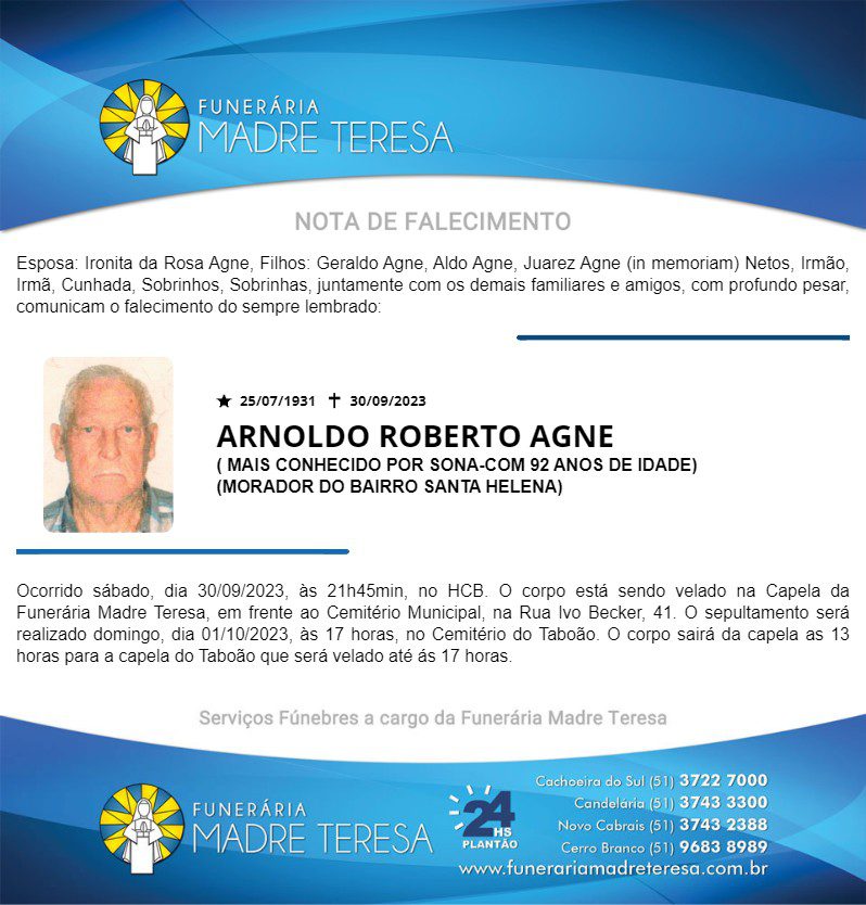 Falecimentos FALECIMENTO: ARNOLDO ROBERTO AGNE Radio Cachoeira 1 de outubro de 2023 Post navigation Previous: LOTERIAS / RESULTADOS / SÁBADO (30)Next: FALECIMENTO: DERCI DE OLIVEIRA FERREIRA Mais notícias Falecimentos MARION DA SILVA (SÃO NUNCA) Francis Soares 21 de fevereiro de 2025 Falecimentos ROMANI KEGLER NUNES Francis Soares 17 de fevereiro de 2025 Falecimentos ROMARINO “EDILON CARDOSO” PEREIRA Francis Soares 17 de fevereiro de 2025 Deixe um comentário Cancelar respostaO seu endereço de e-mail não será publicado. Campos obrigatórios são marcados com *Comentário * Nome * E-mail * Site Salvar meus dados neste navegador para a próxima vez que eu comentar. Δ