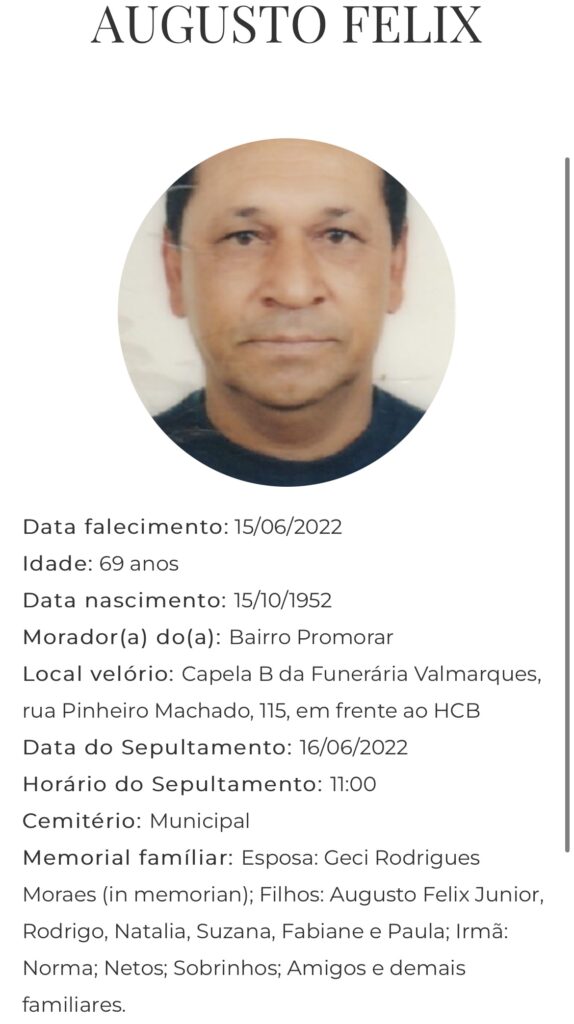 Falecimentos Falecimento / Augusto Felix admin 16 de junho de 2022 Post navigation Previous: Governador do RS Ranolfo Vieira Jr. na abertura oficial da Fenarroz 2022.Next: Programa ao vivo da Arrozeira Marina na Fenarroz! Mais notícias Falecimentos MARION DA SILVA (SÃO NUNCA) Francis Soares 21 de fevereiro de 2025 Falecimentos ROMANI KEGLER NUNES Francis Soares 17 de fevereiro de 2025 Falecimentos ROMARINO “EDILON CARDOSO” PEREIRA Francis Soares 17 de fevereiro de 2025 Deixe um comentário Cancelar respostaO seu endereço de e-mail não será publicado. Campos obrigatórios são marcados com *Comentário * Nome * E-mail * Site Salvar meus dados neste navegador para a próxima vez que eu comentar. Δ