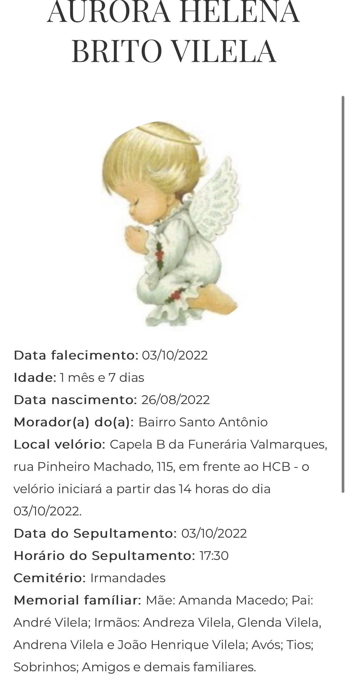 Falecimentos Falecimento / Aurora Helena Brito Vilela Rádio Cachoeira1 3 de outubro de 2022 Post navigation Previous: Falecimento / Ermogenes Terezinha KohlsNext: Vereador Dudu pede Edson Junior como secretário de Desporto! Mais notícias Falecimentos MARION DA SILVA (SÃO NUNCA) Francis Soares 21 de fevereiro de 2025 Falecimentos ROMANI KEGLER NUNES Francis Soares 17 de fevereiro de 2025 Falecimentos ROMARINO “EDILON CARDOSO” PEREIRA Francis Soares 17 de fevereiro de 2025 Deixe um comentário Cancelar respostaO seu endereço de e-mail não será publicado. Campos obrigatórios são marcados com *Comentário * Nome * E-mail * Site Salvar meus dados neste navegador para a próxima vez que eu comentar. Δ