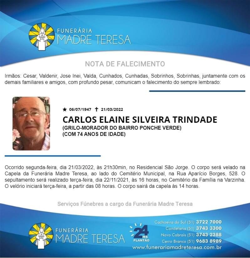 Falecimentos Falecimento / Carlos Elaine Silveira Trindade admin 22 de março de 2022 Post navigation Previous: Falecimento / José Clodoaldo ZigulichNext: Confira os resultados das loterias do dia 21/03! Mais notícias Falecimentos MARION DA SILVA (SÃO NUNCA) Francis Soares 21 de fevereiro de 2025 Falecimentos ROMANI KEGLER NUNES Francis Soares 17 de fevereiro de 2025 Falecimentos ROMARINO “EDILON CARDOSO” PEREIRA Francis Soares 17 de fevereiro de 2025 Deixe um comentário Cancelar respostaO seu endereço de e-mail não será publicado. Campos obrigatórios são marcados com *Comentário * Nome * E-mail * Site Salvar meus dados neste navegador para a próxima vez que eu comentar. Δ