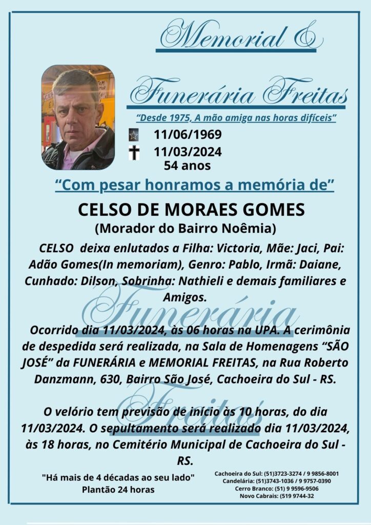 Falecimentos FALECIMENTO: CELSO DE MORAES GOMES Francis Soares 11 de março de 2024 Post navigation Previous: Empresário da Lancheria é Assassinado a Tiros em Cachoeira do SulNext: Homem falece em colisão de veículos no Vale do Rio Pardo Mais notícias Falecimentos MARION DA SILVA (SÃO NUNCA) Francis Soares 21 de fevereiro de 2025 Falecimentos ROMANI KEGLER NUNES Francis Soares 17 de fevereiro de 2025 Falecimentos ROMARINO “EDILON CARDOSO” PEREIRA Francis Soares 17 de fevereiro de 2025 Deixe um comentário Cancelar respostaO seu endereço de e-mail não será publicado. Campos obrigatórios são marcados com *Comentário * Nome * E-mail * Site Salvar meus dados neste navegador para a próxima vez que eu comentar. Δ