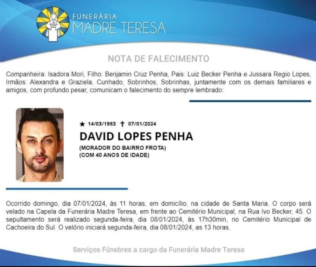 Falecimentos FALECIMENTO: DAVID LOPES PENHA Francis Soares 8 de janeiro de 2024 Post navigation Previous: Escolinha C-18 de Cachoeira faz bonito na 8ª Copa Taquari.Next: ‘Oppenheimer’ e ‘Succession’ são principais vencedores do Globo de Ouro; confira a lista completa Mais notícias Falecimentos MARION DA SILVA (SÃO NUNCA) Francis Soares 21 de fevereiro de 2025 Falecimentos ROMANI KEGLER NUNES Francis Soares 17 de fevereiro de 2025 Falecimentos ROMARINO “EDILON CARDOSO” PEREIRA Francis Soares 17 de fevereiro de 2025 Deixe um comentário Cancelar respostaO seu endereço de e-mail não será publicado. Campos obrigatórios são marcados com *Comentário * Nome * E-mail * Site Salvar meus dados neste navegador para a próxima vez que eu comentar. Δ