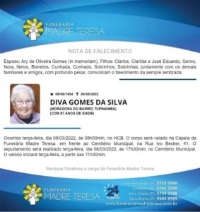 Falecimentos Falecimento/ Diva Gomes da Silva admin 8 de março de 2022 Post navigation Previous: Globo estuda contratar Arthur Aguiar como ator após o BBB22Next: Requerimento sugere Cachoeira do Sul no “Tudo Fácil Empresas” Mais notícias Falecimentos MARION DA SILVA (SÃO NUNCA) Francis Soares 21 de fevereiro de 2025 Falecimentos ROMANI KEGLER NUNES Francis Soares 17 de fevereiro de 2025 Falecimentos ROMARINO “EDILON CARDOSO” PEREIRA Francis Soares 17 de fevereiro de 2025 Deixe um comentário Cancelar respostaO seu endereço de e-mail não será publicado. Campos obrigatórios são marcados com *Comentário * Nome * E-mail * Site Salvar meus dados neste navegador para a próxima vez que eu comentar. Δ