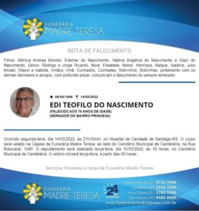 Falecimentos Falecimento / Edi Teofilo do Nascimento admin 15 de março de 2022 Post navigation Previous: Repavimentação, calçamento e pavilhão: Cachoeira assina financiamento de R$ 5 milhõesNext: Falecimento / Maria Geci de Moraes Felix Mais notícias Falecimentos MARION DA SILVA (SÃO NUNCA) Francis Soares 21 de fevereiro de 2025 Falecimentos ROMANI KEGLER NUNES Francis Soares 17 de fevereiro de 2025 Falecimentos ROMARINO “EDILON CARDOSO” PEREIRA Francis Soares 17 de fevereiro de 2025 Deixe um comentário Cancelar respostaO seu endereço de e-mail não será publicado. Campos obrigatórios são marcados com *Comentário * Nome * E-mail * Site Salvar meus dados neste navegador para a próxima vez que eu comentar. Δ