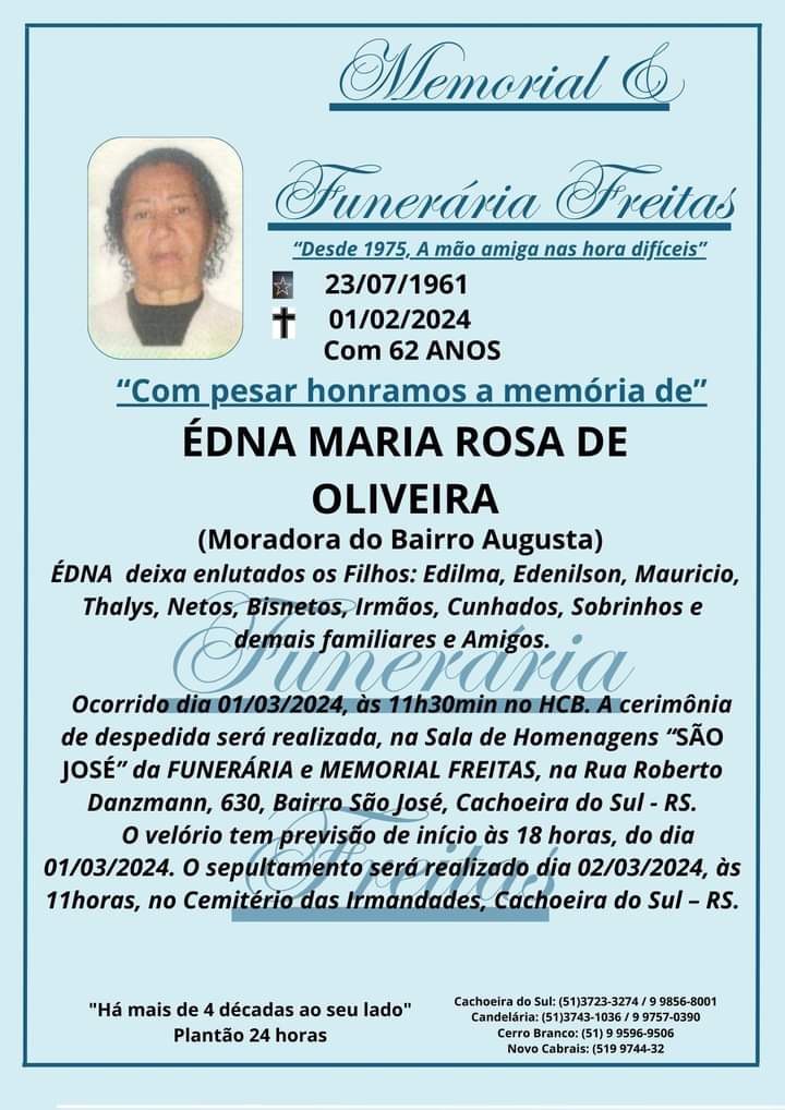 Falecimentos FALECIMENTO: ÉDNA MARIA ROSA DE OLIVEIRA Francis Soares 1 de março de 2024 Post navigation Previous: Começam as atividades do Mês da MulherNext: Câmara de Vereadores de Cachoeira do Sul Recebe Sete Projetos de Lei Ordinária Mais notícias Falecimentos MARION DA SILVA (SÃO NUNCA) Francis Soares 21 de fevereiro de 2025 Falecimentos ROMANI KEGLER NUNES Francis Soares 17 de fevereiro de 2025 Falecimentos ROMARINO “EDILON CARDOSO” PEREIRA Francis Soares 17 de fevereiro de 2025 Deixe um comentário Cancelar respostaO seu endereço de e-mail não será publicado. Campos obrigatórios são marcados com *Comentário * Nome * E-mail * Site Salvar meus dados neste navegador para a próxima vez que eu comentar. Δ