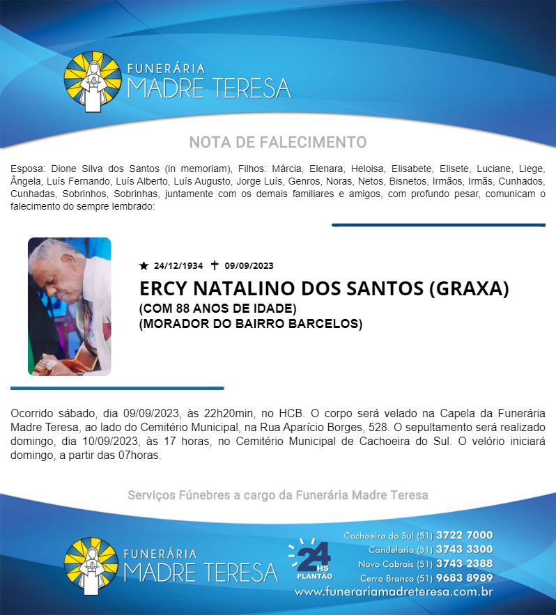 Falecimentos FALECIMENTO: ERCY NATALINO DOS SANTOS (GRAXA) Radio Cachoeira 10 de setembro de 2023 Post navigation Previous: LOTERIAS / RESULTADOS / SÁBADO (9)Next: Governo cria chave PIX de conta oficial para receber doações às vítimas das enchentes Mais notícias Falecimentos MARION DA SILVA (SÃO NUNCA) Francis Soares 21 de fevereiro de 2025 Falecimentos ROMANI KEGLER NUNES Francis Soares 17 de fevereiro de 2025 Falecimentos ROMARINO “EDILON CARDOSO” PEREIRA Francis Soares 17 de fevereiro de 2025 Deixe um comentário Cancelar respostaO seu endereço de e-mail não será publicado. Campos obrigatórios são marcados com *Comentário * Nome * E-mail * Site Salvar meus dados neste navegador para a próxima vez que eu comentar. Δ