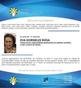 Falecimentos Falecimento / Eva Dorneles Rosa admin 29 de março de 2022 Post navigation Previous: Falecimento / Angelina FernandesNext: Falecimento / Izolete Souza Silva Mais notícias Falecimentos MARION DA SILVA (SÃO NUNCA) Francis Soares 21 de fevereiro de 2025 Falecimentos ROMANI KEGLER NUNES Francis Soares 17 de fevereiro de 2025 Falecimentos ROMARINO “EDILON CARDOSO” PEREIRA Francis Soares 17 de fevereiro de 2025 Deixe um comentário Cancelar respostaO seu endereço de e-mail não será publicado. Campos obrigatórios são marcados com *Comentário * Nome * E-mail * Site Salvar meus dados neste navegador para a próxima vez que eu comentar. Δ