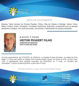 Falecimentos Falecimento / Heitor Peukert Filho admin 7 de março de 2022 Post navigation Previous: Falecimento / Alex da Silva TorbesNext: Falecimento / Maria Edite Moreira Silveira Mais notícias Falecimentos MARION DA SILVA (SÃO NUNCA) Francis Soares 21 de fevereiro de 2025 Falecimentos ROMANI KEGLER NUNES Francis Soares 17 de fevereiro de 2025 Falecimentos ROMARINO “EDILON CARDOSO” PEREIRA Francis Soares 17 de fevereiro de 2025 Deixe um comentário Cancelar respostaO seu endereço de e-mail não será publicado. Campos obrigatórios são marcados com *Comentário * Nome * E-mail * Site Salvar meus dados neste navegador para a próxima vez que eu comentar. Δ