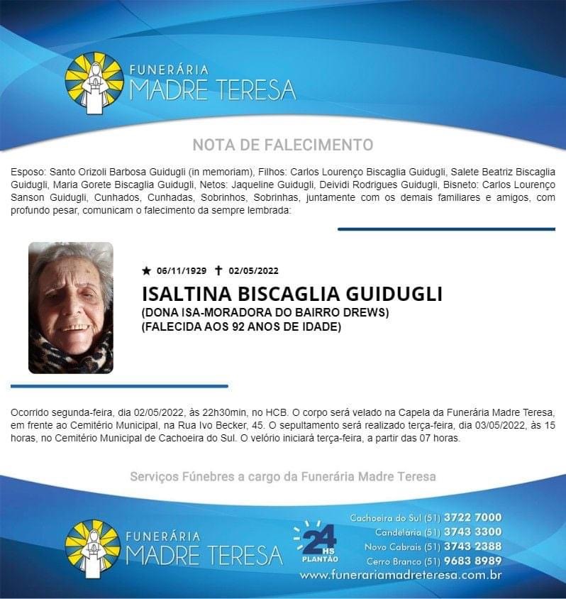 Falecimentos Falecimento / Isaltina Biscaglia Guidugli admin 3 de maio de 2022 Post navigation Previous: Confira os resultados das loterias do dia 02/05!Next: RESTINGA SÊCA | Cinco pessoas foram presas por trafico de entorpecentes. Mais notícias Falecimentos MARION DA SILVA (SÃO NUNCA) Francis Soares 21 de fevereiro de 2025 Falecimentos ROMANI KEGLER NUNES Francis Soares 17 de fevereiro de 2025 Falecimentos ROMARINO “EDILON CARDOSO” PEREIRA Francis Soares 17 de fevereiro de 2025 Deixe um comentário Cancelar respostaO seu endereço de e-mail não será publicado. Campos obrigatórios são marcados com *Comentário * Nome * E-mail * Site Salvar meus dados neste navegador para a próxima vez que eu comentar. Δ