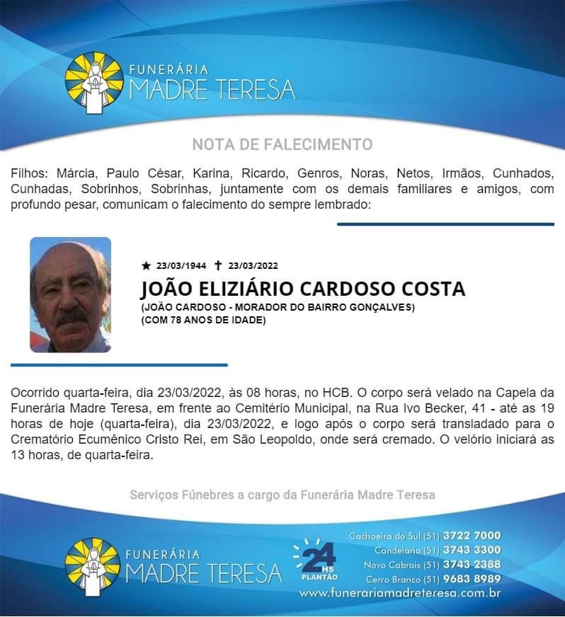 Falecimentos Falecimento / João Elizario Cardoso Costa admin 23 de março de 2022 Post navigation Previous: Expoagro abre programaçãoNext: Falecimento / Vera Regina Alves Dutra Mais notícias Falecimentos MARION DA SILVA (SÃO NUNCA) Francis Soares 21 de fevereiro de 2025 Falecimentos ROMANI KEGLER NUNES Francis Soares 17 de fevereiro de 2025 Falecimentos ROMARINO “EDILON CARDOSO” PEREIRA Francis Soares 17 de fevereiro de 2025 Deixe um comentário Cancelar respostaO seu endereço de e-mail não será publicado. Campos obrigatórios são marcados com *Comentário * Nome * E-mail * Site Salvar meus dados neste navegador para a próxima vez que eu comentar. Δ