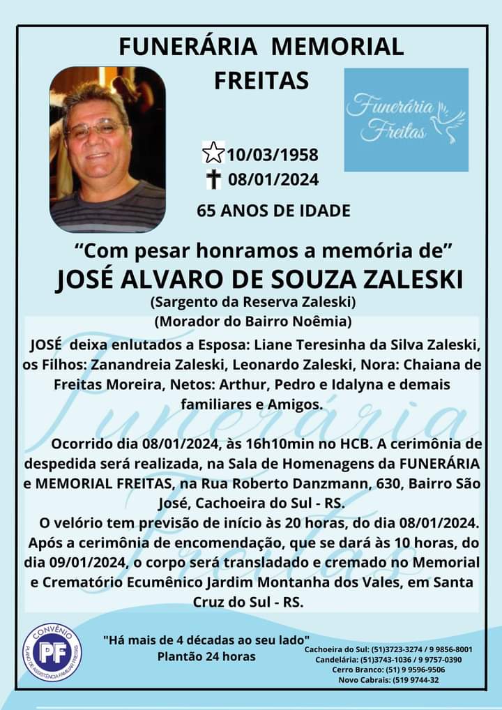 Falecimentos FALECIMENTO | JOSÉ ALVARO DE SOUZA ZALESKI Francis Soares 9 de janeiro de 2024 Post navigation Previous: Verão agitado? Novo desafeto ocorreu no centro de Cachoeira.Next: URGENTE I Acidente em frente a igreja São José Mais notícias Falecimentos MARION DA SILVA (SÃO NUNCA) Francis Soares 21 de fevereiro de 2025 Falecimentos ROMANI KEGLER NUNES Francis Soares 17 de fevereiro de 2025 Falecimentos ROMARINO “EDILON CARDOSO” PEREIRA Francis Soares 17 de fevereiro de 2025 Deixe um comentário Cancelar respostaO seu endereço de e-mail não será publicado. Campos obrigatórios são marcados com *Comentário * Nome * E-mail * Site Salvar meus dados neste navegador para a próxima vez que eu comentar. Δ