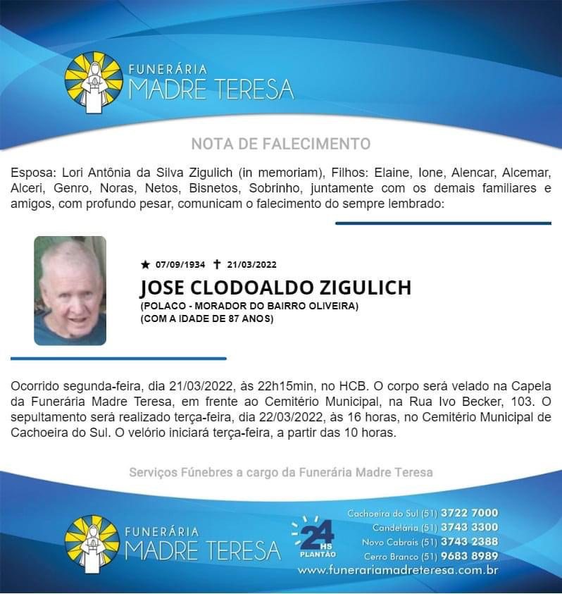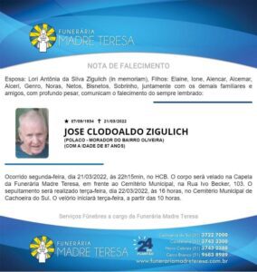 Falecimentos Falecimento / José Clodoaldo Zigulich admin 22 de março de 2022 Post navigation Previous: Falecimento / Gilvan Ribeiro FloresNext: Falecimento / Carlos Elaine Silveira Trindade Mais notícias Falecimentos MARION DA SILVA (SÃO NUNCA) Francis Soares 21 de fevereiro de 2025 Falecimentos ROMANI KEGLER NUNES Francis Soares 17 de fevereiro de 2025 Falecimentos ROMARINO “EDILON CARDOSO” PEREIRA Francis Soares 17 de fevereiro de 2025 Deixe um comentário Cancelar respostaO seu endereço de e-mail não será publicado. Campos obrigatórios são marcados com *Comentário * Nome * E-mail * Site Salvar meus dados neste navegador para a próxima vez que eu comentar. Δ