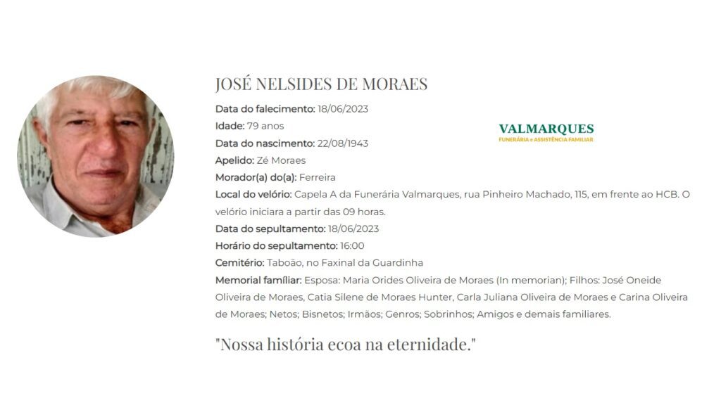 Falecimentos FALECIMENTO: JOSÉ NELSIDES DE MORAES Radio Cachoeira 18 de junho de 2023 Post navigation Previous: LOTERIAS / RESULTADOS / SÁBADO (17)Next: Bolsa Família paga valor extra Mais notícias Falecimentos MARION DA SILVA (SÃO NUNCA) Francis Soares 21 de fevereiro de 2025 Falecimentos ROMANI KEGLER NUNES Francis Soares 17 de fevereiro de 2025 Falecimentos ROMARINO “EDILON CARDOSO” PEREIRA Francis Soares 17 de fevereiro de 2025 Deixe um comentário Cancelar respostaO seu endereço de e-mail não será publicado. Campos obrigatórios são marcados com *Comentário * Nome * E-mail * Site Salvar meus dados neste navegador para a próxima vez que eu comentar. Δ