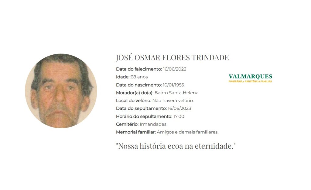 Falecimentos FALECIMENTO: JOSÉ OSMAR FLORES TRINDADE Radio Cachoeira 16 de junho de 2023 Post navigation Previous: FALECIMENTO: MARIA ANTÔNIA VENITE DE OLIVEIRANext: Quartas de finais do Futebol 7 de Paraíso do Sul serão no domingo Mais notícias Falecimentos MARION DA SILVA (SÃO NUNCA) Francis Soares 21 de fevereiro de 2025 Falecimentos ROMANI KEGLER NUNES Francis Soares 17 de fevereiro de 2025 Falecimentos ROMARINO “EDILON CARDOSO” PEREIRA Francis Soares 17 de fevereiro de 2025 Deixe um comentário Cancelar respostaO seu endereço de e-mail não será publicado. Campos obrigatórios são marcados com *Comentário * Nome * E-mail * Site Salvar meus dados neste navegador para a próxima vez que eu comentar. Δ