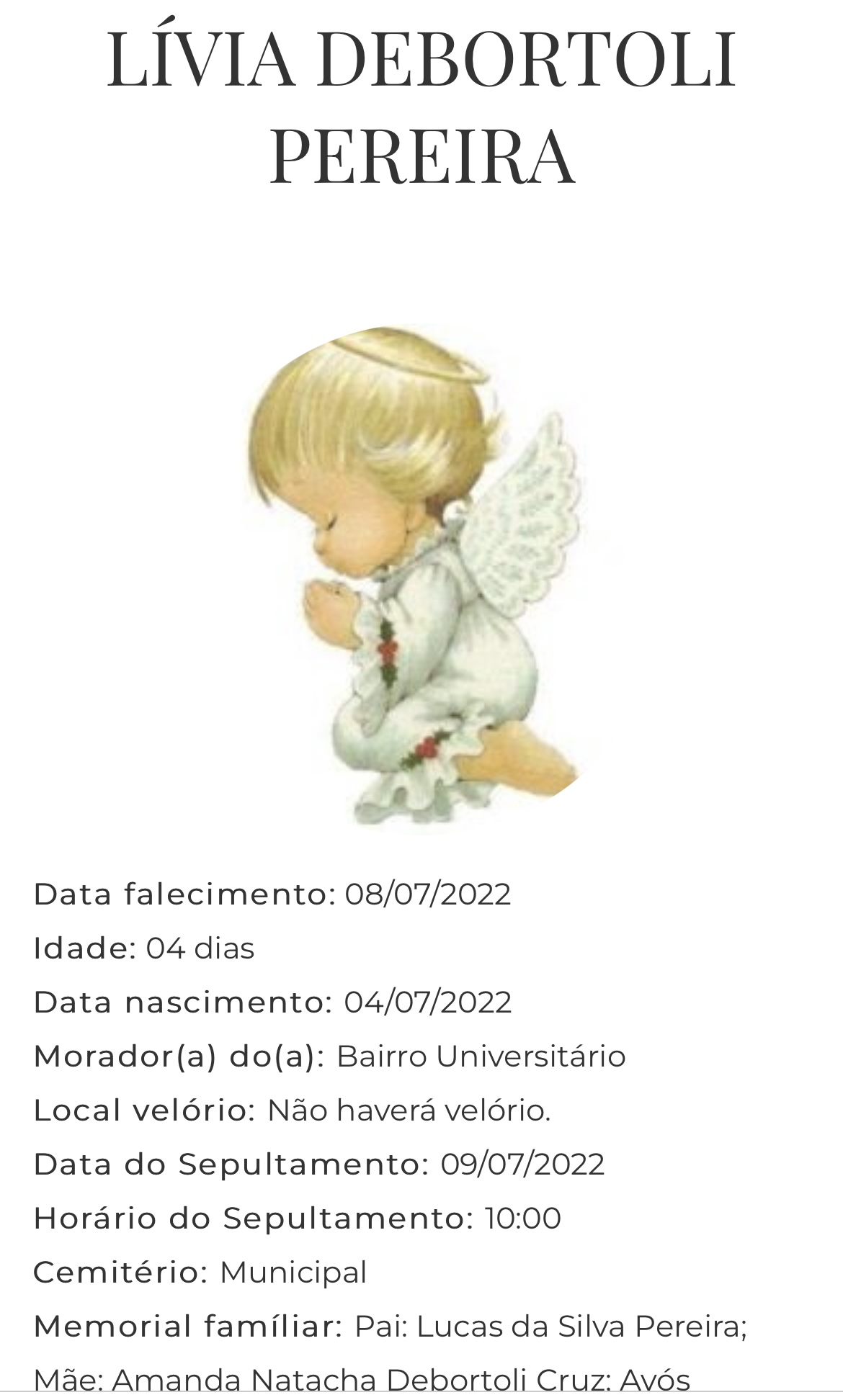 Falecimentos Falecimento / Livia Debortoli Pereira admin 8 de julho de 2022 Post navigation Previous: Falecimento / Maria Erondina Nunes de SouzaNext: Confira os resultados das loterias de hoje Mais notícias Falecimentos MARION DA SILVA (SÃO NUNCA) Francis Soares 21 de fevereiro de 2025 Falecimentos ROMANI KEGLER NUNES Francis Soares 17 de fevereiro de 2025 Falecimentos ROMARINO “EDILON CARDOSO” PEREIRA Francis Soares 17 de fevereiro de 2025 Deixe um comentário Cancelar respostaO seu endereço de e-mail não será publicado. Campos obrigatórios são marcados com *Comentário * Nome * E-mail * Site Salvar meus dados neste navegador para a próxima vez que eu comentar. Δ