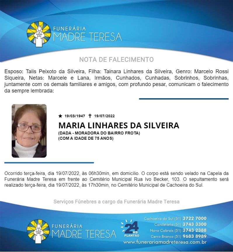 Falecimentos Falecimento / Maria Linhares da Silveira admin 19 de julho de 2022 Post navigation Previous: Governo do RS abre processo seletivo de estágio para educaçãoNext: Pantanal: casamento de Juma e Jove terá briga e Alcides no hospital Mais notícias Falecimentos MARION DA SILVA (SÃO NUNCA) Francis Soares 21 de fevereiro de 2025 Falecimentos ROMANI KEGLER NUNES Francis Soares 17 de fevereiro de 2025 Falecimentos ROMARINO “EDILON CARDOSO” PEREIRA Francis Soares 17 de fevereiro de 2025 Deixe um comentário Cancelar respostaO seu endereço de e-mail não será publicado. Campos obrigatórios são marcados com *Comentário * Nome * E-mail * Site Salvar meus dados neste navegador para a próxima vez que eu comentar. Δ