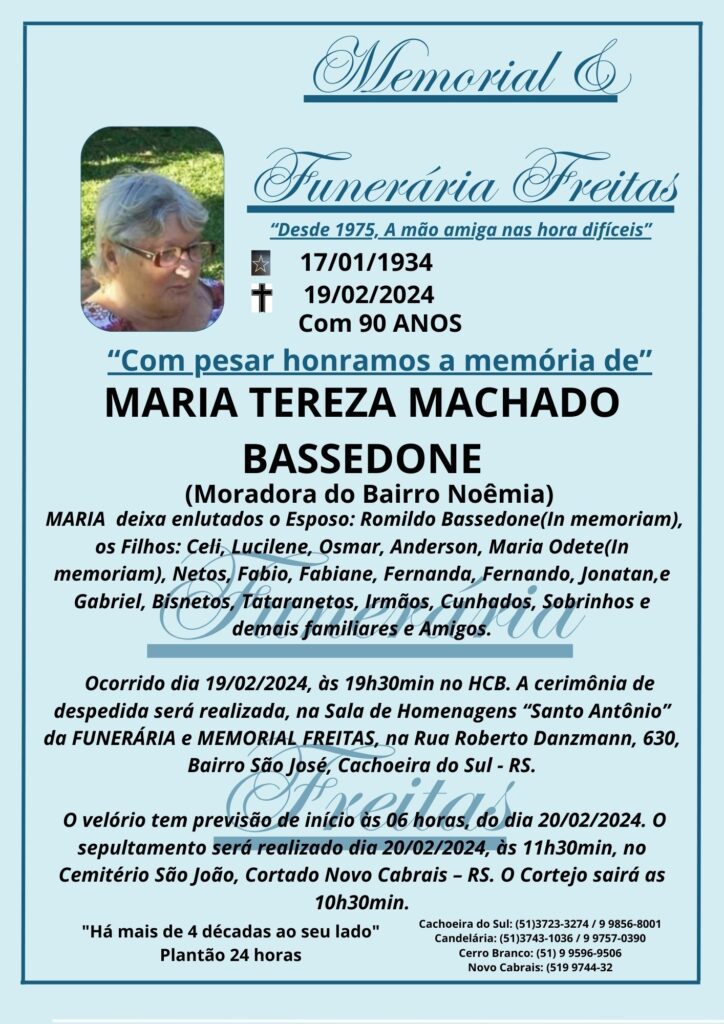 Últimas Notícias Falecimentos FALECIMENTO: MARIA TEREZA MACHADO BASSEDONE Francis Soares 20 de fevereiro de 2024 Post navigation Previous: Secretária de obras de Novo Cabrais emite boletin informativo de serviços realizadosNext: DESCASO E ABANDONO NA RUA ARTHUR DECKER: MORADORES DE FÁTIMA ALERTAM PARA PERIGO NAS VIAS Mais notícias Brasil e Mundo Política Últimas Notícias STF julga nesta segunda a manutenção da prisão preventiva de Jair Bolsonaro Francis Soares 24 de novembro de 2025 Cidade Últimas Notícias Inadimplência dispara e Prefeitura revela números preocupantes do IPTU e da Taxa de Lixo 2025 Francis Soares 21 de novembro de 2025 Cidade Últimas Notícias Inmetro fiscaliza postos de combustíveis em Cachoeira do Sul com acompanhamento do Procon Francis Soares 20 de novembro de 2025 Deixe um comentário Cancelar respostaO seu endereço de e-mail não será publicado. Campos obrigatórios são marcados com *Comentário * Nome * E-mail * Site Salvar meus dados neste navegador para a próxima vez que eu comentar. Δ