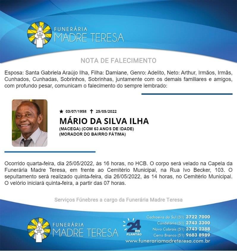 Falecimentos Falecimento / Mario da Silva Ilha admin 26 de maio de 2022 Post navigation Previous: Confira os resultados das loterias do dia 25/05Next: Falecimento / Alex Santos dos Santos Mais notícias Falecimentos MARION DA SILVA (SÃO NUNCA) Francis Soares 21 de fevereiro de 2025 Falecimentos ROMANI KEGLER NUNES Francis Soares 17 de fevereiro de 2025 Falecimentos ROMARINO “EDILON CARDOSO” PEREIRA Francis Soares 17 de fevereiro de 2025 Deixe um comentário Cancelar respostaO seu endereço de e-mail não será publicado. Campos obrigatórios são marcados com *Comentário * Nome * E-mail * Site Salvar meus dados neste navegador para a próxima vez que eu comentar. Δ
