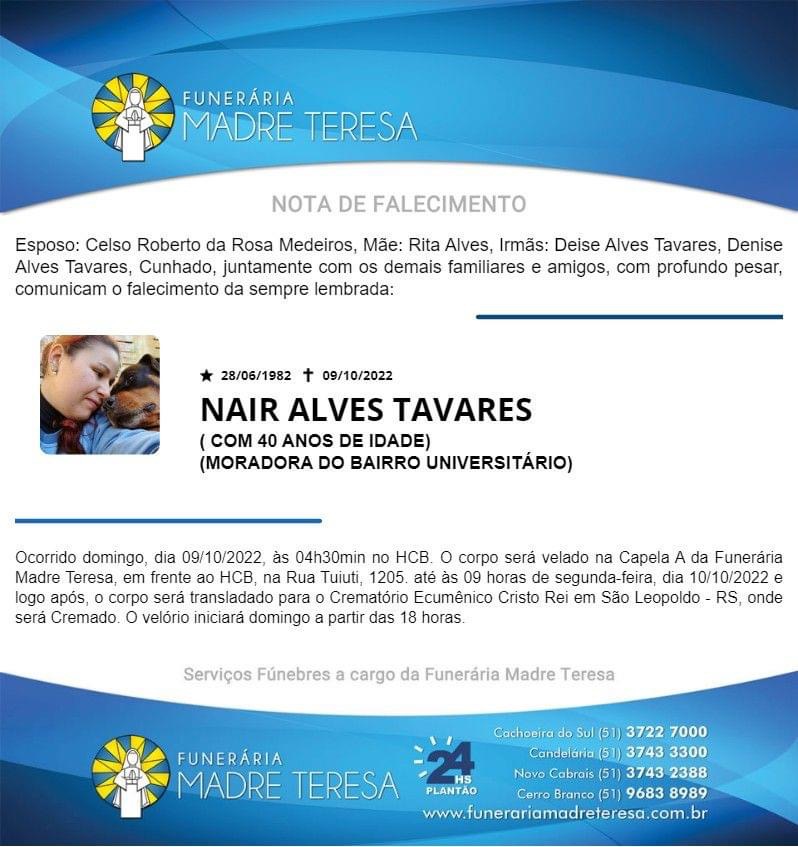 Falecimentos Falecimento / Nair Alves Tavares Rádio Cachoeira1 10 de outubro de 2022 Post navigation Previous: Falecimento / Maria de Lourdes Balardin SilvaNext: Semana começa com frio e pancadas de chuva no RS Mais notícias Falecimentos MARION DA SILVA (SÃO NUNCA) Francis Soares 21 de fevereiro de 2025 Falecimentos ROMANI KEGLER NUNES Francis Soares 17 de fevereiro de 2025 Falecimentos ROMARINO “EDILON CARDOSO” PEREIRA Francis Soares 17 de fevereiro de 2025 Deixe um comentário Cancelar respostaO seu endereço de e-mail não será publicado. Campos obrigatórios são marcados com *Comentário * Nome * E-mail * Site Salvar meus dados neste navegador para a próxima vez que eu comentar. Δ
