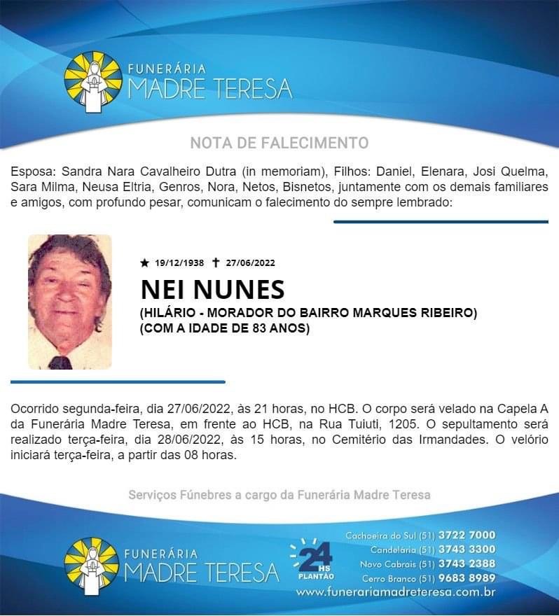 Falecimentos Falecimento / Nei Nunes admin 28 de junho de 2022 Post navigation Previous: Inscrições para o Sisu começam nesta terça-feiraNext: Falecimento / Venira Irene Müller Mais notícias Falecimentos MARION DA SILVA (SÃO NUNCA) Francis Soares 21 de fevereiro de 2025 Falecimentos ROMANI KEGLER NUNES Francis Soares 17 de fevereiro de 2025 Falecimentos ROMARINO “EDILON CARDOSO” PEREIRA Francis Soares 17 de fevereiro de 2025 Deixe um comentário Cancelar respostaO seu endereço de e-mail não será publicado. Campos obrigatórios são marcados com *Comentário * Nome * E-mail * Site Salvar meus dados neste navegador para a próxima vez que eu comentar. Δ