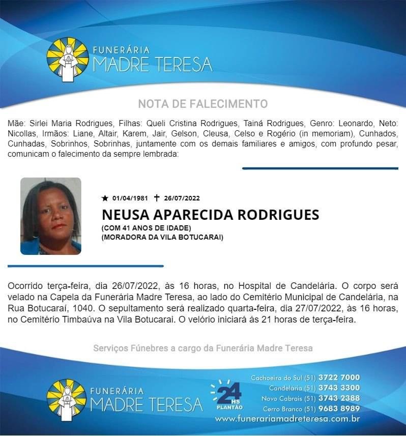 Falecimentos Falecimento / Neusa Aparecida Rodrigues admin 26 de julho de 2022 Post navigation Previous: Acidente na RSC-287 em Candelária deixa 3 pessoas feridas.Next: Falecimento / Dirceu Nunes da Silveira Mais notícias Falecimentos MARION DA SILVA (SÃO NUNCA) Francis Soares 21 de fevereiro de 2025 Falecimentos ROMANI KEGLER NUNES Francis Soares 17 de fevereiro de 2025 Falecimentos ROMARINO “EDILON CARDOSO” PEREIRA Francis Soares 17 de fevereiro de 2025 Deixe um comentário Cancelar respostaO seu endereço de e-mail não será publicado. Campos obrigatórios são marcados com *Comentário * Nome * E-mail * Site Salvar meus dados neste navegador para a próxima vez que eu comentar. Δ