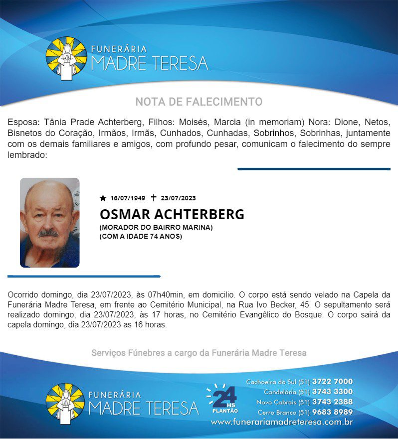 Falecimentos FALECIMENTO: OSMAR ACHTERBERG Radio Cachoeira 23 de julho de 2023 Post navigation Previous: FALECIMENTO: DIRCEU DA SILVANext: Consumidores de baixa renda serão os mais impactados com possível fim do WhatsApp ilimitado nos pacotes das operadoras Mais notícias Falecimentos MARION DA SILVA (SÃO NUNCA) Francis Soares 21 de fevereiro de 2025 Falecimentos ROMANI KEGLER NUNES Francis Soares 17 de fevereiro de 2025 Falecimentos ROMARINO “EDILON CARDOSO” PEREIRA Francis Soares 17 de fevereiro de 2025 Deixe um comentário Cancelar respostaO seu endereço de e-mail não será publicado. Campos obrigatórios são marcados com *Comentário * Nome * E-mail * Site Salvar meus dados neste navegador para a próxima vez que eu comentar. Δ